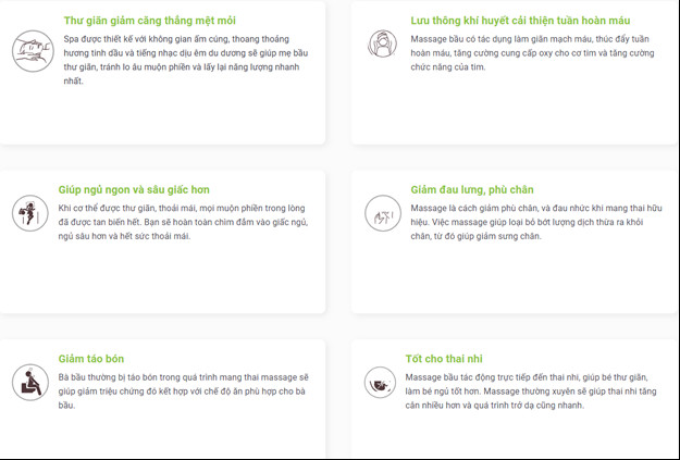 Sau liệu trình chăm bầu dưỡng sinh, dưỡng tâm, dưỡng sắc trong không gian thư giãn thơm mát với các bản nhạc thai giáo cho bé sẽ giúp các mẹ bầu giảm stress, cân bằng tâm lý, xóa tan nhức mỏi toàn thân, phù nề chân tay, đau đầu, giảm căng cơ, đào thải độc tố, tầm soát cân nặng, da trắng hồng và tái tạo làn da sáng hồng mướt mịn.
